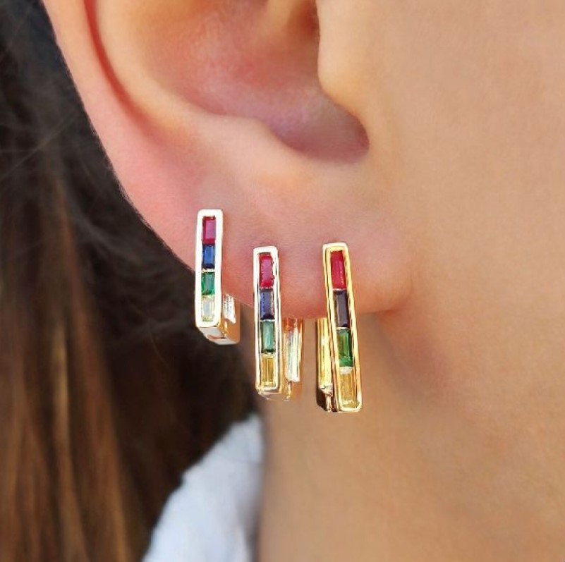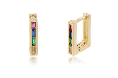 Argola M cravejada com zircônias coloridas, com banho de ouro 18K.