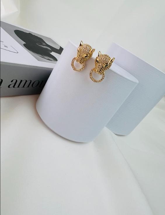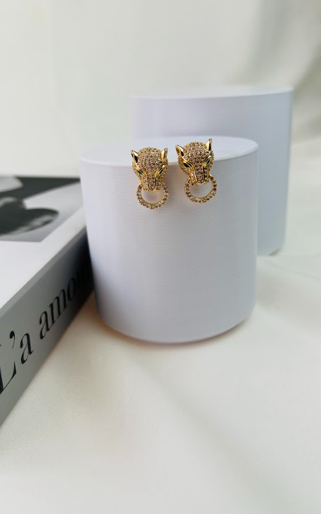 Brinco brinco em formato de tigre com cravação em zircônias, folheado a Ouro 18K.