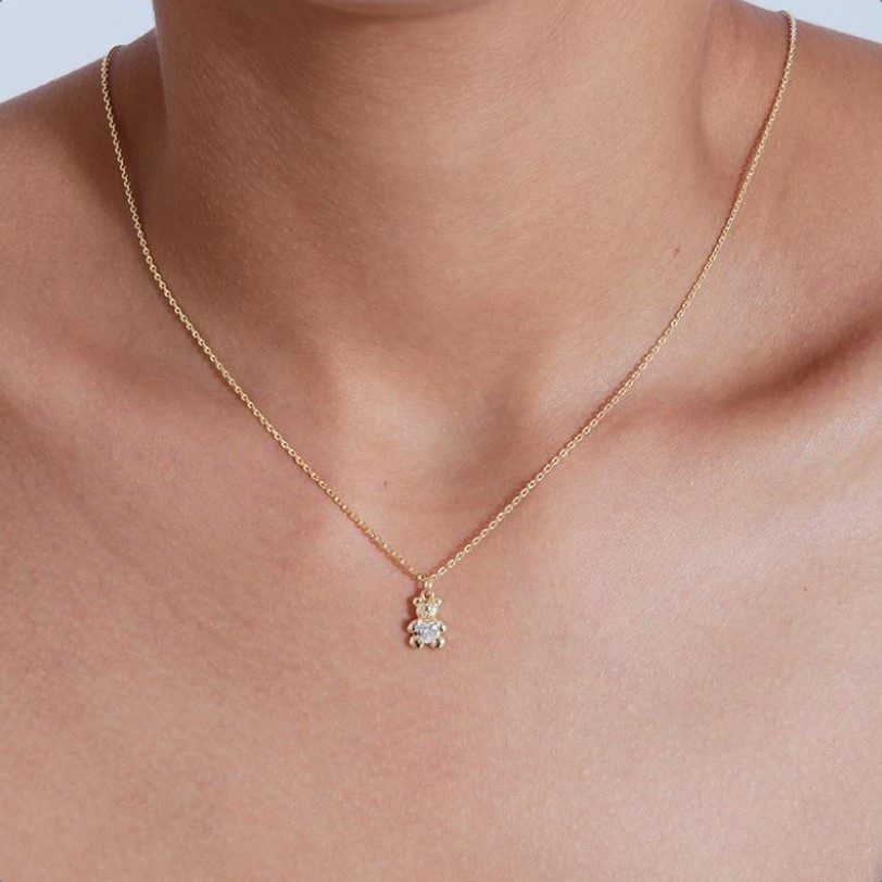 Colar com corrente de mini elos e pingente em formato de ursinho com detalhe em zircônia incolor, banho de ouro 18K.