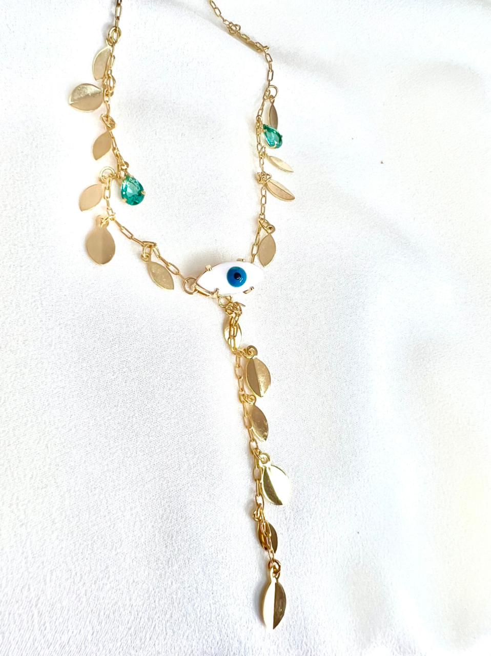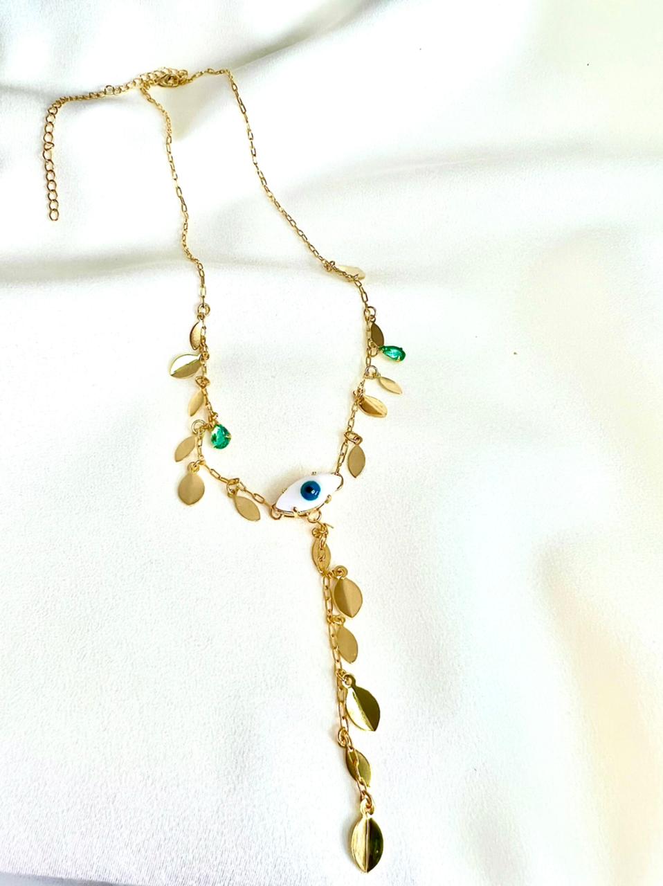 COLAR GRAVATA OLHO GREGO COM PEDRAS VERDES | BANHO OURO 18K