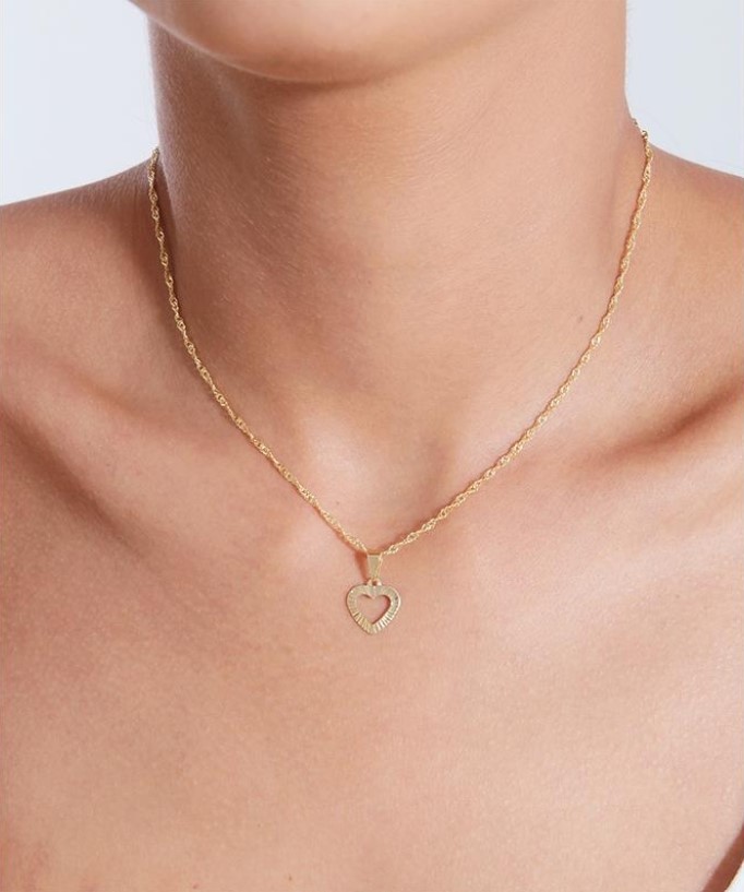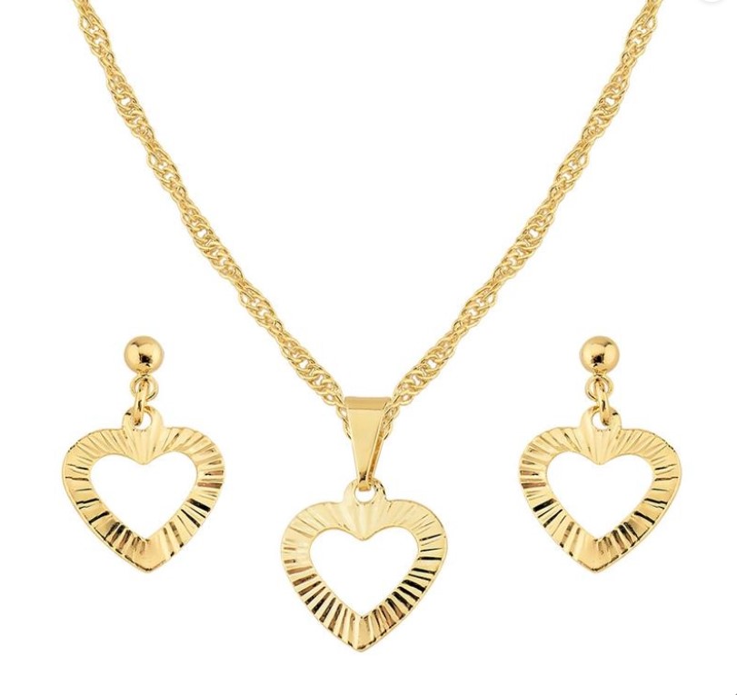 Conjunto de colar e brinco em formado de corações vazados, com acabamento diamantado, possuindo corrente modelo Singapura, banho de ouro 18K.