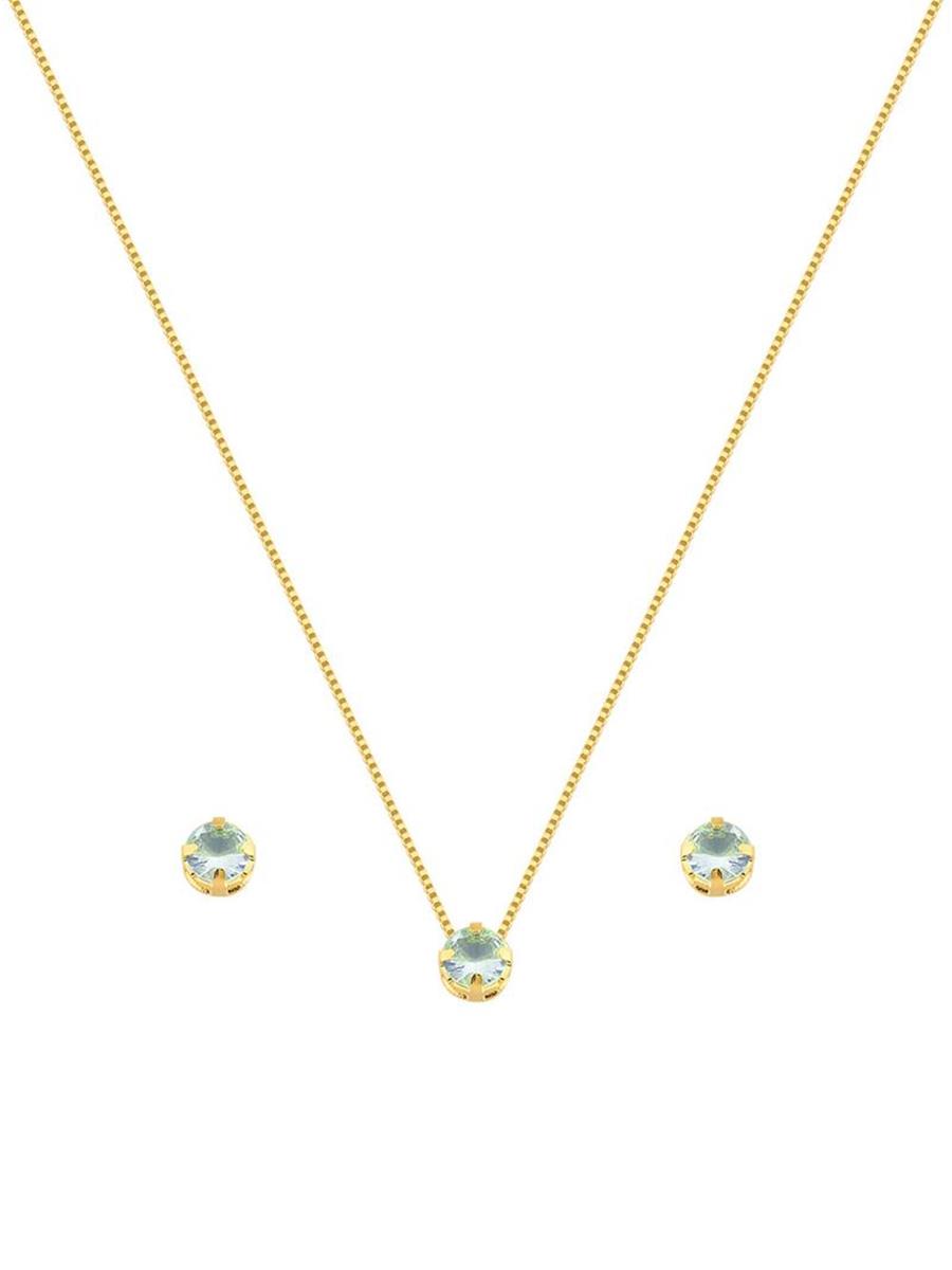 Conjunto de colar e brinco com ponto de luz em cristal aqua, folheado a ouro 18K.